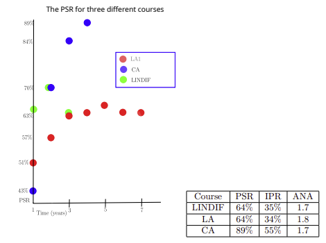 The first effect is especially important for courses before the selection moment (like BSA) has taken place; for our courses this is the case for LA1. The PSR should not be viewed in isolation, but can be compared to similarly obtained percentages from courses in the same program/year. Specifically for first year courses we can also compare the PSR to the BSA-rate: a course with a PSR close to the BSA-rate could be the ”bottleneck” of the program. Whenever the PSR of a course is significantly lower (or higher) this could mean that there could be a problem with the course: this can, e.g., be an indication that a course is too hard (or too easy). The courses LINDIF and CA are after selection has taken place; the high PSR of CA (89%) basically means that all students have passed already/will pass the course. For LINDIF, the PSR showed a similar trend, until we saw a sudden drop in the third year. Such a drop may indicate a problem in that particular year. Indeed, this cohort had collectively adopted an ”efficient” way of studying: they used AI-generated summaries of lecture recordings