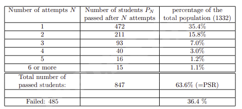 This means that the PSR is a more reliable measure for the success rate of a course. In our (artificial) example, we observe that the PSR equals 80%; four out of five students pass the exam eventually. When determining the PSR we can also compute another interesting parameter: the average number of attempts a students needs to pass the exam (ANA).